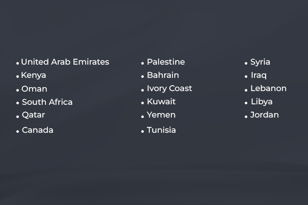 Jordan, Iraq, Lebanon, Syria, Libya, Yemen, Canada, Tunisia, Ivory Coast,